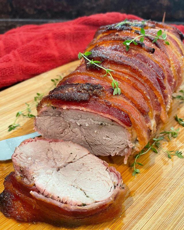 Remove from oven once bacon is crispy and let your tender pork rest for at least 10 minutes before slicing to serve.